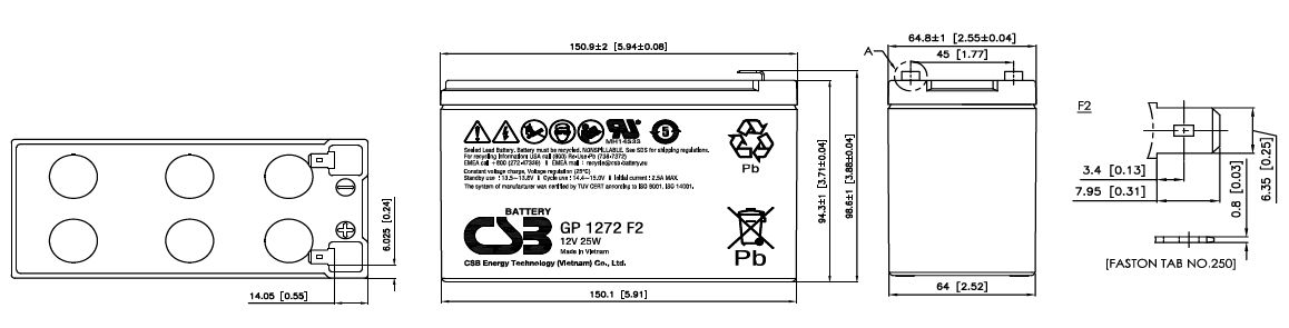 Рабочая температура 25 °С Напряжение подзаряда 13.5 - 13.8 В при 25 °С Максимальный ток заряда 2.5 A Напряжение заряда в режиме выравнивания 14.4 - 15.0 В при 25 °С Саморазряд Менее 10% за 90 дней. Можно хранить без подзаряда до 6 месяцев при +25 °C. Выводы F2 (Faston Tab 250) Материал корпуса Ударопрочный, износостойкий ABS (UL94-HB)
