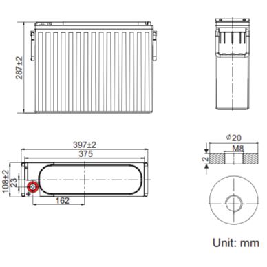 Общая высота: 278 ± 2 мм Вес 31.0 кг Выводы M8 Материал корпуса Сосуд и крышка из огнестойкого пластика PC-ABS по UL94 V-0 Емкость (25 °C) 96.6 Aч (20 ч, 4.83 A, 1.80 В/Эл)