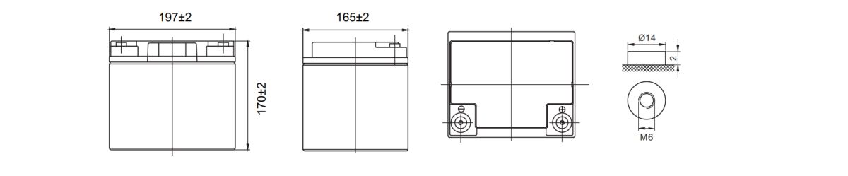Хранение : -40 ˚С ~ 60 ˚С Номинальная рабочая температура 25 ˚С Напряжение постоянного подзаряда 13.5 – 13.8 В при 25 ˚С (темп. коэф. -18 мВ/°С) Максимальный ток разряда (5 сек) 400 A Максимальный ток заряда 13.5 A Напряжение заряда 14.5 – 15.0 В при 25 ˚С (темп. коэф. -30 мВ/°С) Саморазряд Батареи STAR могут храниться до 6 месяцев при 25 °С, без подзаряда* Материал корпуса Ударопрочный ABS (акрило-бутадиен-стирол) Срок службы Более 12 лет в буферном режиме при 25 ˚С Длина 197 ± 2 мм Ширина 165 ± 2 мм Высота (с клеммами) 170 ± 2 мм Вес 14.5 кг ± 3% Выводы Под болт М6 (момент затяжки – 5.1 Нм ± 0.6 Нм)