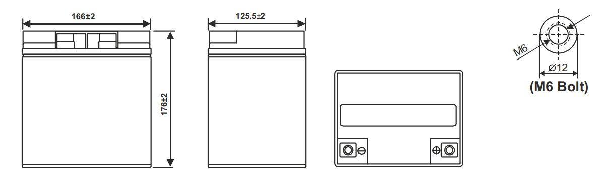 Хранение: от -40 ˚С до + 60 ˚С Напряжение подзаряда: 13.5 - 13.8 В при 25 °С (темп. комп. -3 мВ/˚С/Эл.) Максимальный ток заряда: 9.0 A Напряжение заряда при циклическом режиме: 14.4 - 15.0 В при 25 °С (темп. комп. -5 мВ/˚С/Эл.) Саморазряд: До 6 месяцев при 25 °С, без подзаряда Выводы: Под болт М6 (момент затяжки болтов 7-9 Нм) Материал корпуса: Ударопрочный ABS (акрило-бутадиен-стирол) Кол-во элементов в блоке: 6 Оптимальная рабочая температура: 25 °С