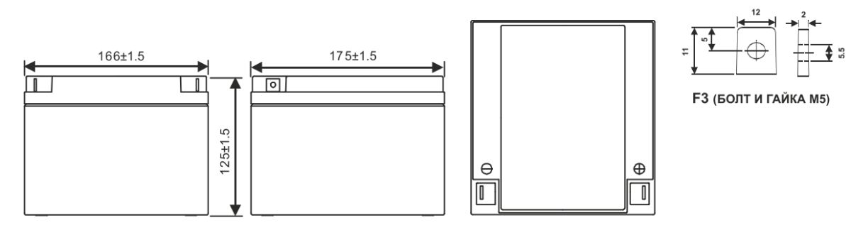 Хранение: от -40 °C до +60 °C Номинальная рабочая температура 25 °C Напряжение подзаряда 13.5 - 13.8 В при 25 °C (темп. ком. -3 мВ/˚С/Эл.) Максимальный ток заряда 7.8 A Напряжение заряда при циклическом режиме 14.4 - 15.0 В при 25 °C (темп. ком. -5 мВ/˚С/Эл.) Срок хранения До 6 месяцев при 25 °C, без подзаряда* Выводы F3, под болт с гайкой M5 Материал корпуса Ударопрочный ABS (акрило-бутадиен-стирол)