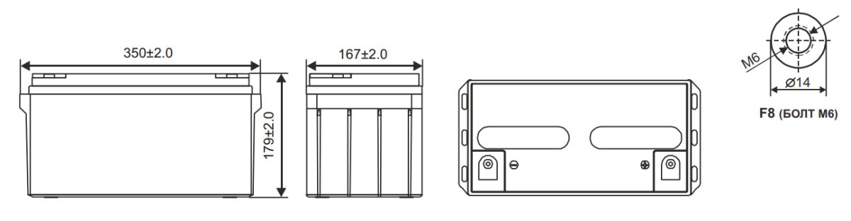 Хранение: от -40 °C до +60 °C Номинальная рабочая температура 25 °C Напряжение подзаряда 13.5 - 13.8 В при 25 °C (темп. комп. -3 мВ/˚С/Эл.) Максимальный ток заряда 19.5 A Напряжение заряда при циклическом режиме 14.4 - 15.0 В при 25 °C (темп. комп. -5 мВ/˚С/Эл.) Срок хранения До 6 месяцев при 25 °C, без подзаряда* Выводы F8 под болт М6 Материал корпуса Ударопрочный ABS (акрило-бутадиен-стирол)