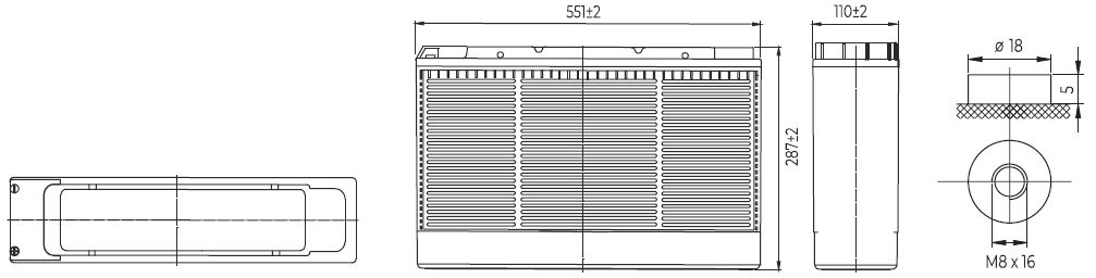 Оптимальная рабочая температура: 25 ˚С Напряжение подзаряда: 13.5 - 13.8 В при 25 °С (тем. коэфф. -18 мВ/ ˚С) Максимальный ток заряда: 45 A Напряжение заряда при циклическом режиме: 14.5 - 15.0 В при 25 °С (тем. коэфф. -30 мВ/ ˚С) Саморазряд: До 6 месяцев при 25 °С, без подзаряда Выводы: Под болт М8 Материал корпуса: Ударопрочный ABS (акрило-бутадиен-стирол) Срок службы (при 25 ̊С): 12 лет в буферном режиме Расчетное количество циклов: 260 циклов при 100%