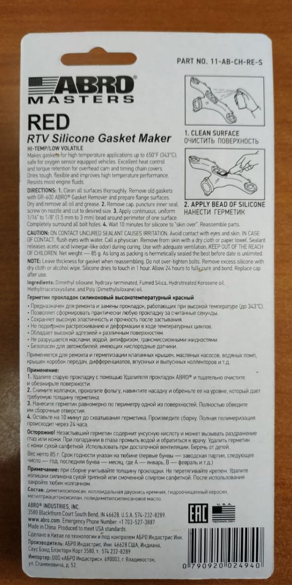 Герметик ABRO 85г. красный, формирователь прокладок